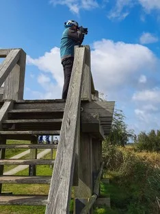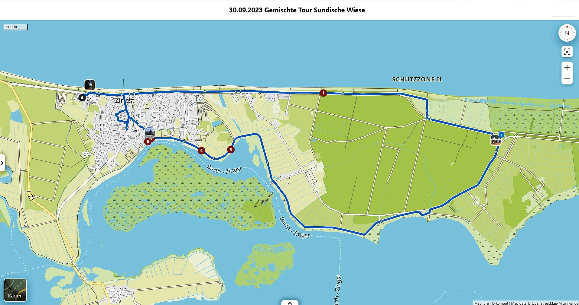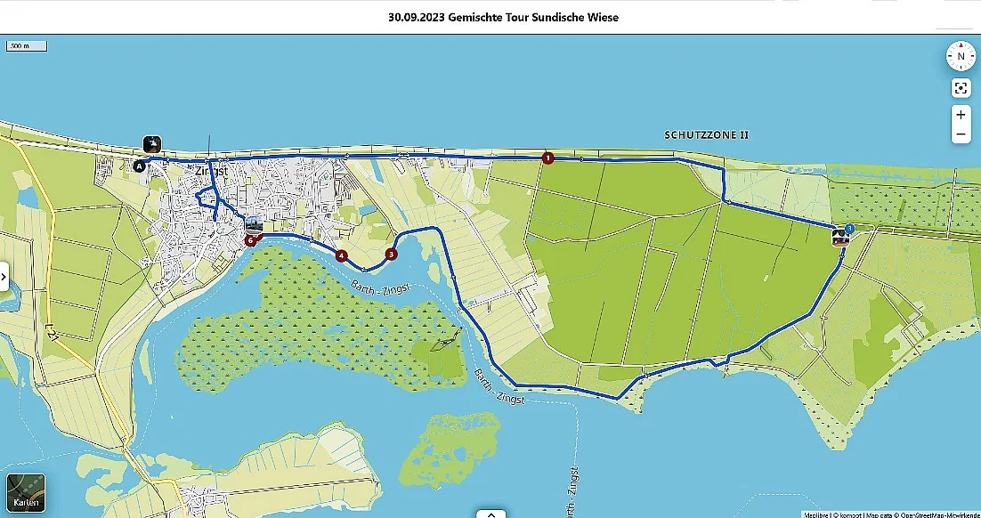 Heute und finden die alljährlichen Zingster Nationalparktage statt. Gegen 10.30 Uhr starten wir zum Festgelände an der Sundischen Wiese. Nach rund 4 Km merkt Tobias, dass der Akku seiner Fotokamera nur noch 7% Strom hat und der Ersatzakku noch im Quartier liegt. Also "vorwärts, wir müssen zurück!" Martina fährt inzwischen weiter. Aus dem Programmheft hatten wir uns eine um 12 Uhr beginnenden geführte Radwanderung ausgesucht. Bei der Buchung am Infozelt stellt sich heraus, dass es eine Wanderung ist und die Radtour erst um 14.30 Uhr und zwar vom Hafen Zingst stattfindet. Begründung: Druckfehler im Programm! Also lassen wir uns erst einmal im Biergarten des Schlößchens an der Sundischen Wiese nieder und essen Steak vom Grill. Dann radeln wir die rund 9 Km zurück bis zum Hafen nach Zingst. Die Tour wird aber aufgrund des extremen Gegenwinds zur "Tortur." Am Hafen lassen wir uns auf einer Bank nieder und harren der Dinge. 14.30 Uhr rückt näher - aber von der geführten Radwanderung keine Spur. Also sind wir da einem Irrtum aufgesessen. Wir fahren ins Zingster Zentrum und trinken im Restaurant "Scubo" Kaffee/Heiße Schokolade. Anschließend fahren wir zurück in Richtung Quartier und gehen an den Strand. Dort lassen wir den Nachmittag bei schöner Sonne ausklingen.